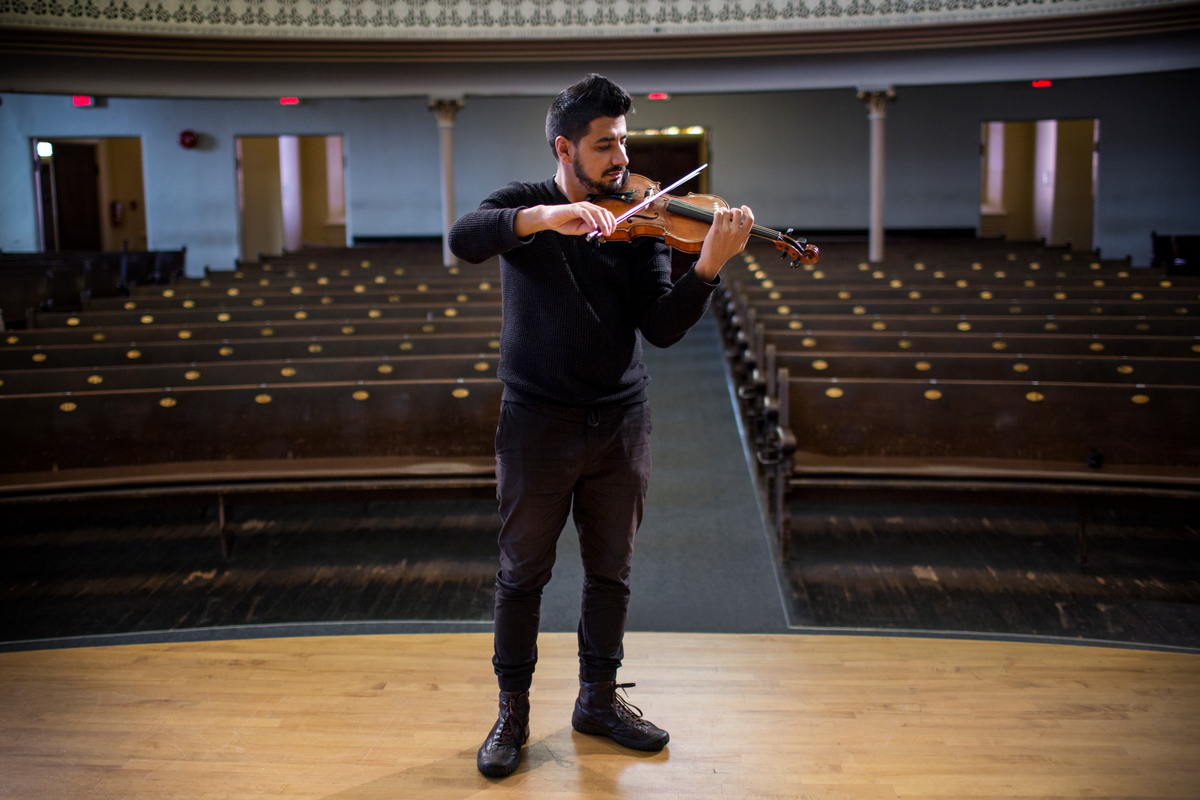يعزف ساري على كمانه في قاعة أليكس غولدن بيرفورمنس في معهد فيكتوريا الموسيقي.