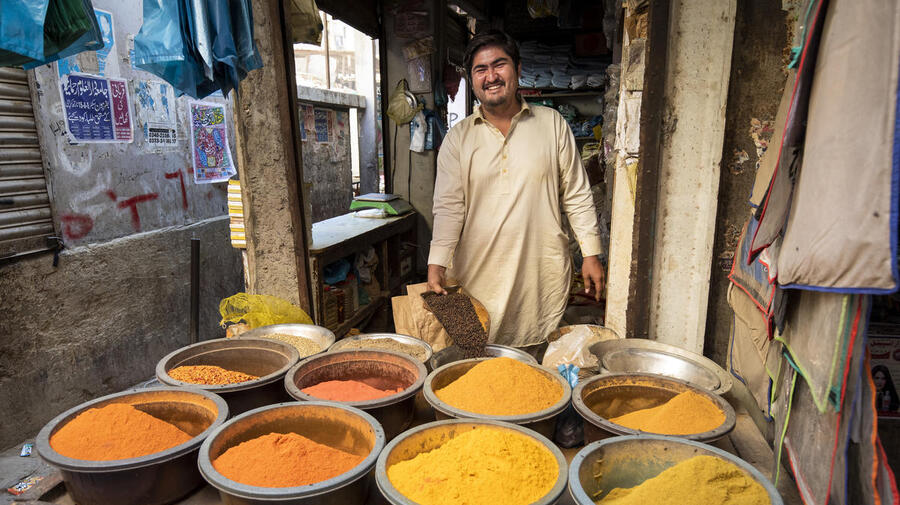 في ركن صغير من أركان أحد الأسواق الصاخبة في جنوب باكستان، يغرس محمد عظيم أصابعه في براميل من الفلفل الأحمر الفاقع. تراه مبتسماً إذ أن توابله تباع جيداً اليوم.