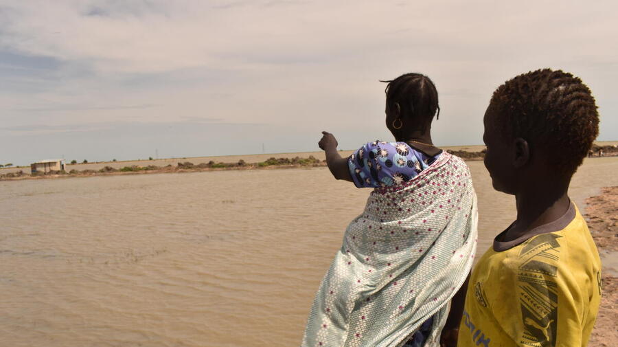 تنظر نياويغا توش إلى المياه التي تغطي مخيم القناعة للاجئين في ولاية النيل الأبيض في السودان. تكاد لا تصدق أنه قبل شهر تقريباً، كان المخيم يعج بالحياة.