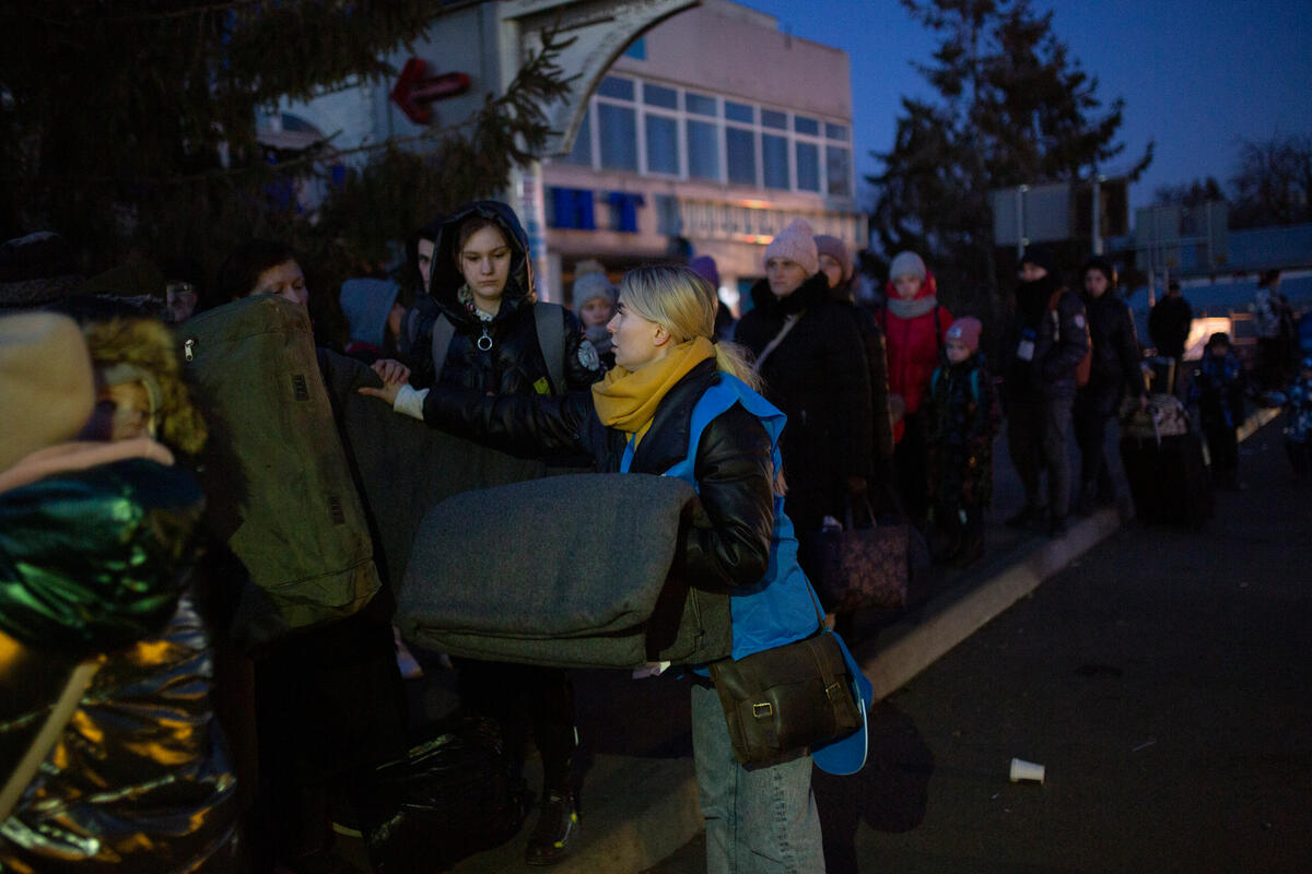 موظفو المفوضية يوزعون البطانيات الحرارية عند نقطة شيهيني للعبور، على النازحين من أوكرانيا والذين ينتظرون العبور إلى بولندا.