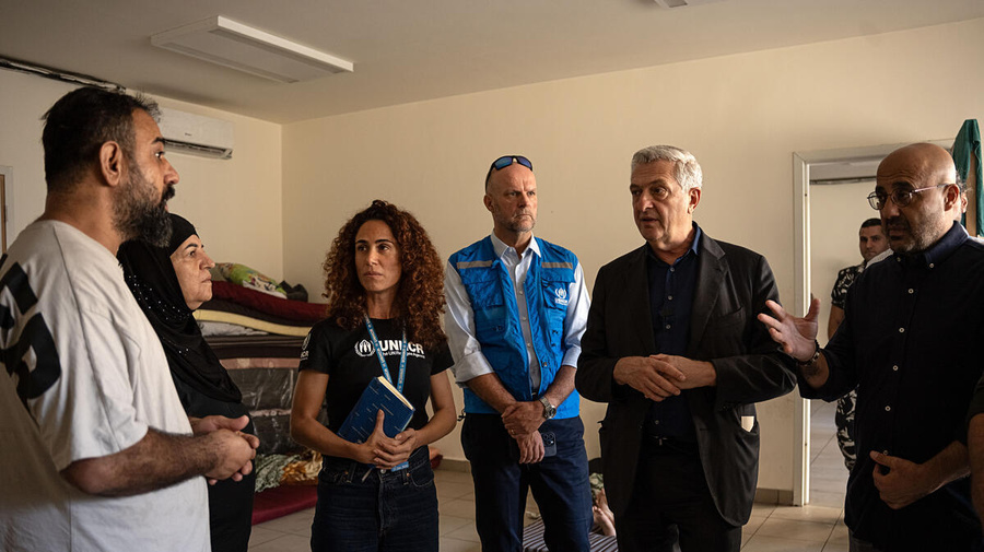 المفوض السامي للأمم المتحدة لشؤون اللاجئين فيليبو غراندي (الثاني من اليمين) ووزير البيئة اللبناني ناصر ياسين (يمين) يلتقيان عائلة لبنانية نازحة تأوي في مدرسة في بيروت.
