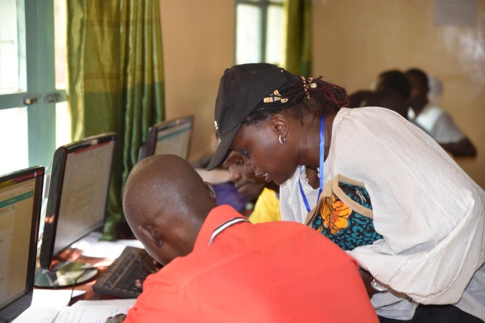تنحني خبيرة التكنولوجيا مريم جامي فوق شاشة كمبيوتر لتوجيه طالب في مركز تدريب في مخيم كاكوما للاجئين في كينيا. إنها تعرف مدى أهمية المساعدة المقدمة لهؤلاء الصغار.