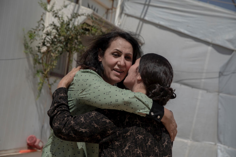 أربع نساءٍ يجلسن معاً حول طبيبة الأمراض النسائية نغم حسن في مقصورة من غرفة واحدة في مخيم روانغا للنازحين، الواقع في إقليم كردستان العراق. ترتدي الدكتورة نغم معطفاً أبيض اللون وتطمئن كل مريضة على حدة. تقترب أكثر، ممسكة بيد ليلى، ثم تستدير قليلاً لتتفحص نبض امرأة أخرى بنظرة يغلب عليها التركيز الشديد.
