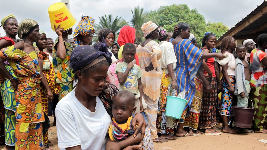 Displaced people in western Côte d'Ivoire queue up for relief items, but aid delivery around Abidjan is getting harder due to ongoing violence.