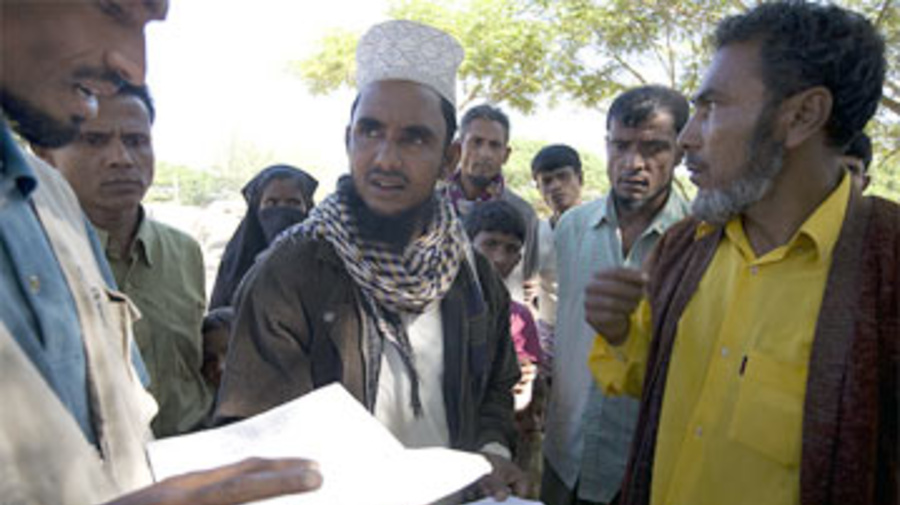 Hafez Jalal Uddin (centre), secretary of the Kutupalong Camp Management Committee, discusses water problems with refugees. As he walks through the camp, Uddin is frequently stopped by fellow refugees seeking his help or advice.
