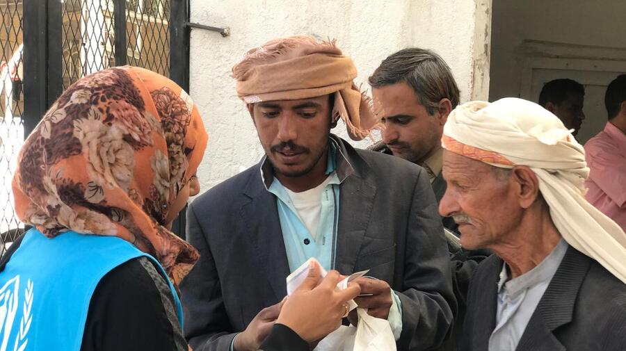 A UNHCR staffer assists displaced Yemenis outside the IDP Community Centre in Sana'a.