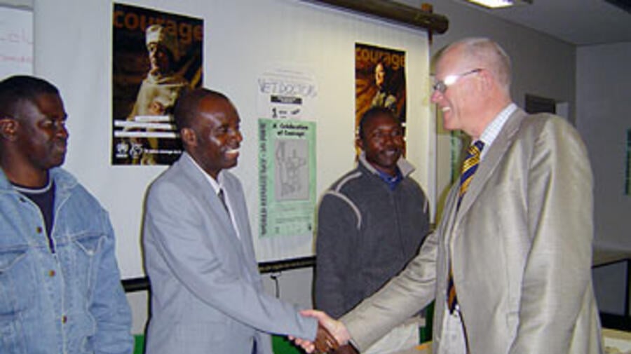 UNHCR's Deputy Representative in South Africa, Fedde Groot, chats with refugee veterinarians at the World Refugee Day event in Cape Town.