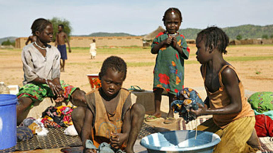 Refugee children wash their families' clothes in Djabal camp. Many children are overwhelmed with daily chores and as a result attend school only sporadically.