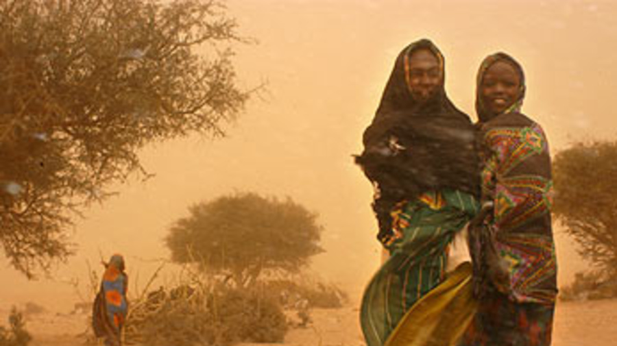 Two young Sudanese refugee girls are caught in a sandstorm in Chad's border town of Tine while waiting for a UNHCR truck to move them to an inland camp. UNHCR/H.Caux