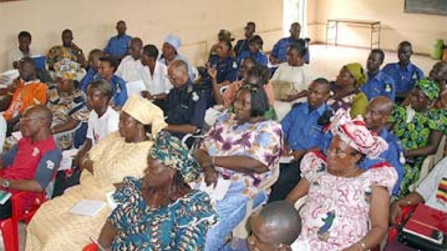 Sierra Leonean police officers and aid workers in a training session on gender-based violence issues.