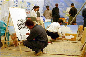 This desperate spot was to remain Yazin's home for the next 18 months. For him and his family, life had, yet again, taken a turn for the worse and yet again, it was art that kept Yazin from despair. With the help of UNHCR and the international non-governmental organisation, CARE, Yazin set up a studio for artists and started teaching other refugees painting and drawing.