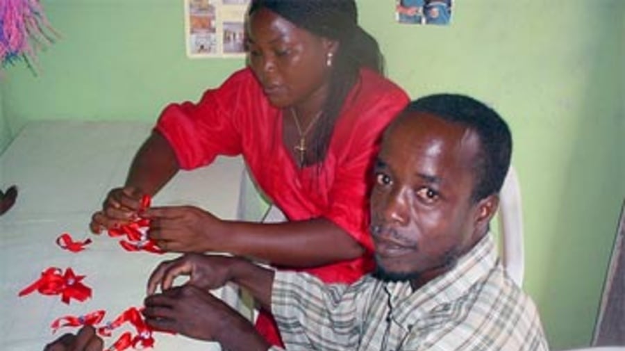 Making World Aids Day red ribbons at the Harmony Community Centre.