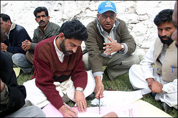 UNHCR's Melesse Tegegne giving pointers on site planning to Pakistani officials in Muzaffarabad. They in turn will train others.