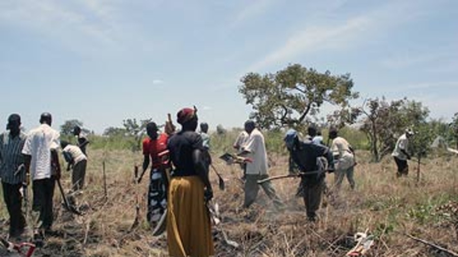 In northern Uganda, formerly displaced people use their UNHCR-supplied tools to clear land for a primary school and a road in exchange for food for their families.