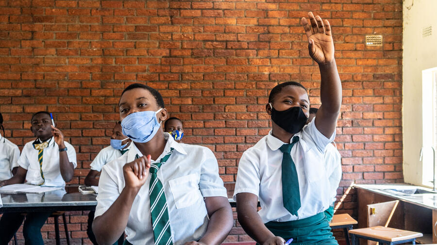 Students attend a science lesson at St. Michaels secondary school in Tongogara Refugee Camp in Chipinge, Zimbabwe, on 26 April 2021.