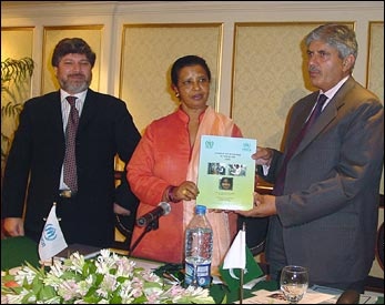 Launching the "Census Report of Afghans living in Pakistan": (from left) Pakistan's Director of Chief Commissionerate of Afghan Refugees Imran Zeb, UNHCR Representative Guenet Guebre-Christos, and States and Frontiers Regions (SAFRON) Secretary Sajid Hussain Chattha.
