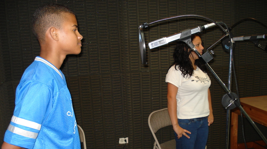 Some of the Colombian refugees and Costa Rican teenagers in the recording studio.