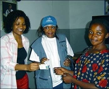 Congolese refugee Sifa (right) receiving the camp's first ID card from UNHCR's Marie Louise Dzietham and INAR's Rosa Chissaque.