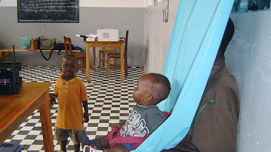Taking photos of toddlers for the refugee registration at Marratane camp involves hiding Mum behind a UN-blue cloth.