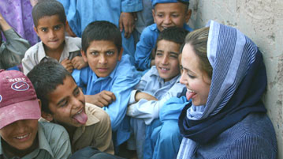 UNHCR Goodwill Ambassador Angelina Jolie joking with Afghan children in a refugee camp in Peshawar, during her last visit to Pakistan in May 2005.