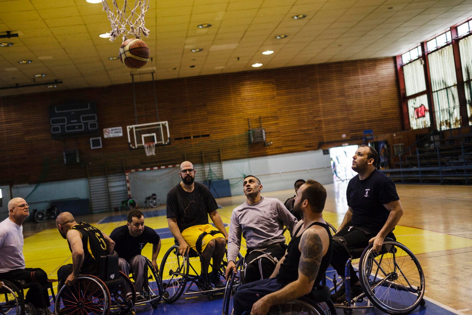 Ibrahim commits himself to a rigorous sports training schedule. Three days per week, he swims with ALMA, a Greek non-profit organization for athletes with disabilities. His training is held in the former 2004 Olympic sport complex in Athens. He is also part of a wheelchair basketball team in Maroussi, an Athens suburb, that meets five times per week and travels across the country for games.