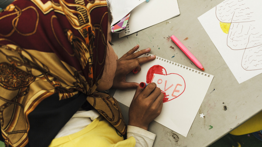 A young girl from Afghanistan drawing during a class of art activities at the Elaionas temporary accommodation site.