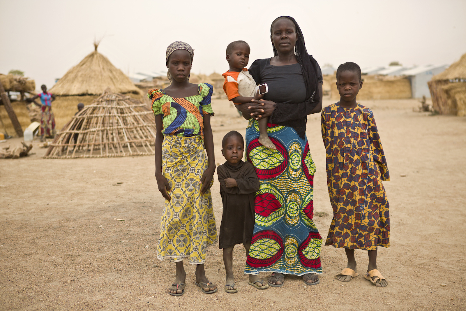 Ibrahim (right) stands with his mother and three siblings in Minawao camp, Cameroon. "It is not easy," his mother says. "The children without a father, fetching water, preparing food.
