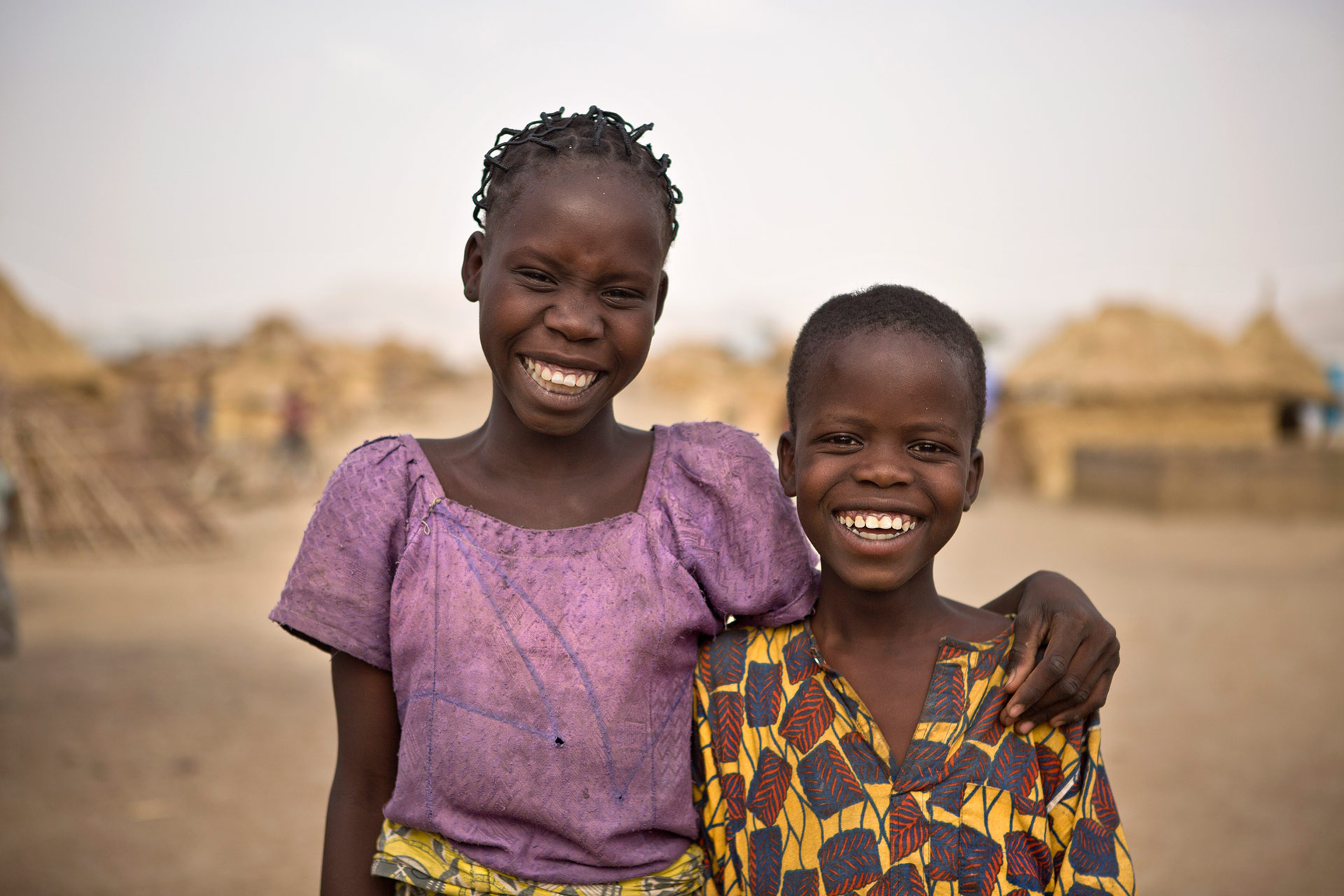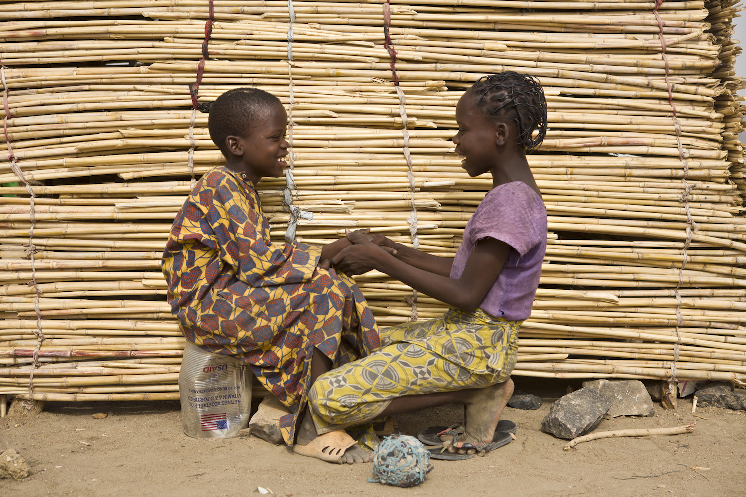 Ibrahim and his sister, Larama, 13, chat in front of their shelter in Minawao camp, Cameroon. "I am the one who unburied him and carried him on my back," says Larama.