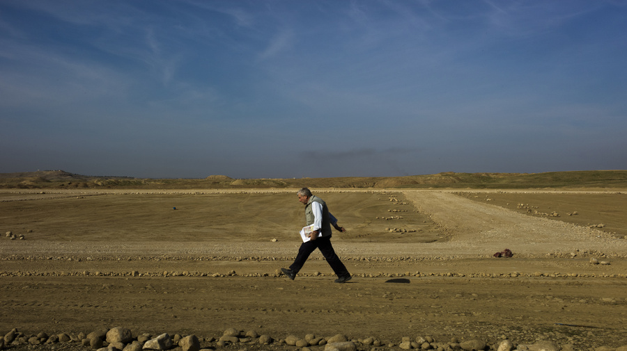 UNHCR's Chris Nixon walks a camp perimeter, his strides measuring the size of the camp, which UNHCR is building in northern Iraq to house some 2,500 Iraqis displaced by conflict.