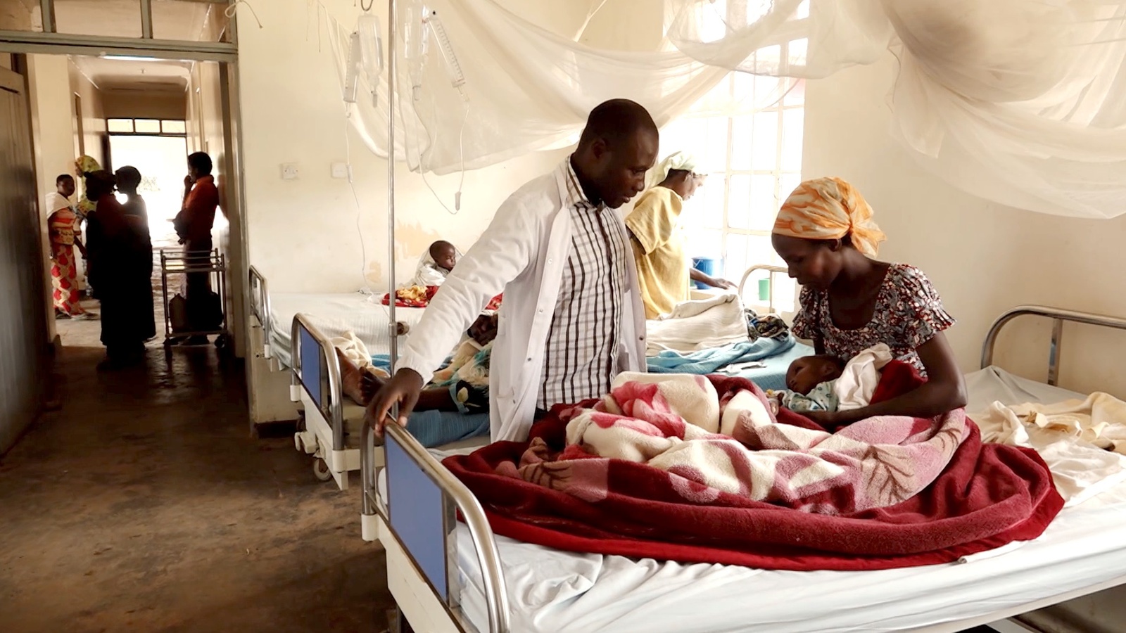 Bosco starts his daily work routine at eight o’clock. White lab coat on, he heads straight for the paediatric ward, where all the beds are occupied. Many children shiver with high fever under their blankets because of malaria. A few malnourished toddlers are hooked up to drips supplying therapeutic food.