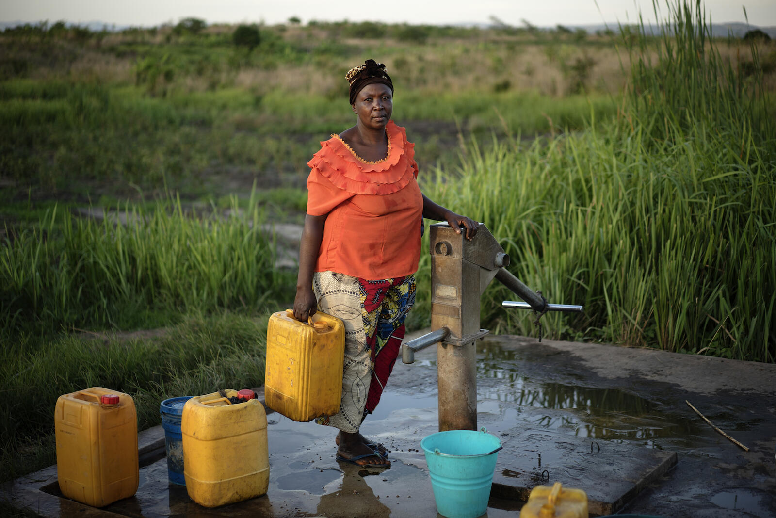 Okenge Sakina collects water at the well in Lukwangulo, DR Congo.