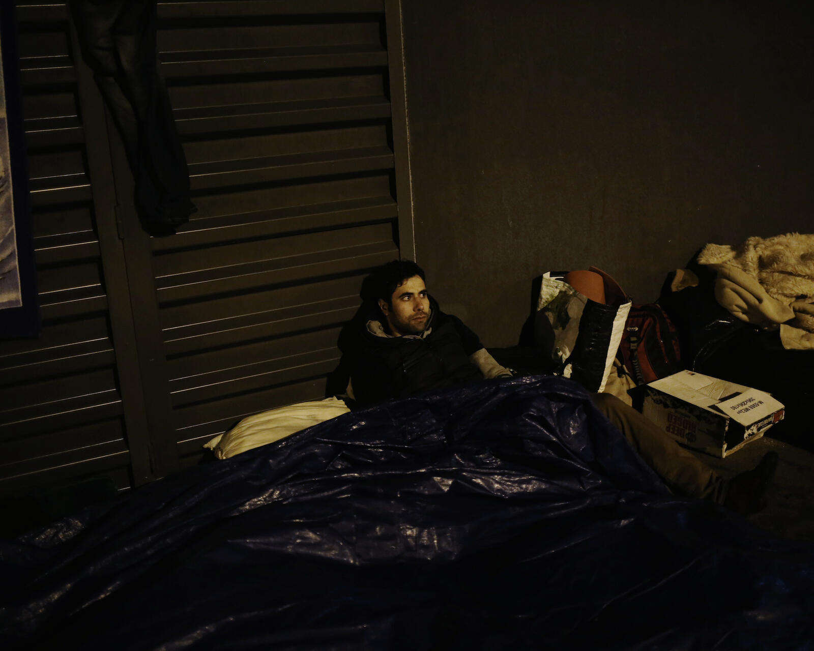 Behind him, on the cold, hard tarmac, sleeping bags and blankets line the loading bay. This is where he and about 20 other Syrians have been living since they came to Calais several months ago. Around the port town itself, there are hundreds of others – from war-torn countries like Afghanistan, Eritrea, Sudan and beyond – all with the same goal: England.