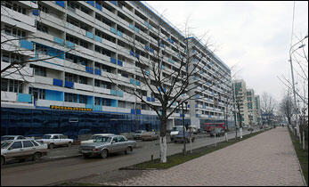 One of Grozny's main thoroughfares fringed by new buildings. Signs of physical reconstruction are to be found everywhere in the city, which was largely destroyed in two recent conflicts.