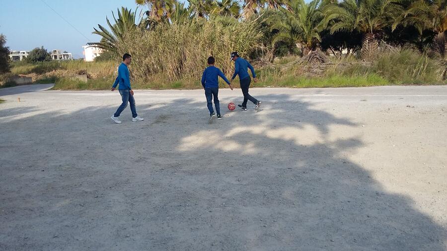 Unaccompanied Afghan refugee Samir, aged 14, plays football with friends at a transit facility on Kos.