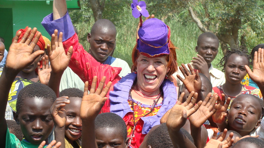 A member of Clowns Without Borders, surrounded by Congolese children.