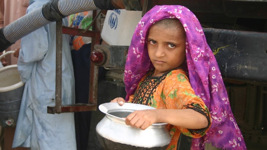A young girl waits for water for her family at a relief camp in Sukkur district.