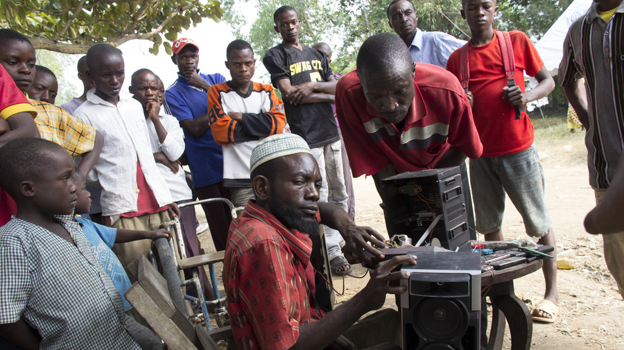 Never disheartened by being paralyzed in his legs by polio as a child, he took up repairing shoes - without any encouragement from his parents. "I just encouraged myself," he says from the primitive wheelchair that brought him to safety in Uganda. "I realized I was just sitting there doing nothing and I realized I can't live like this." Five years ago, at the age of 30, he broadened his skills by persuading a friend to teach him the art and science of electronics repairs.