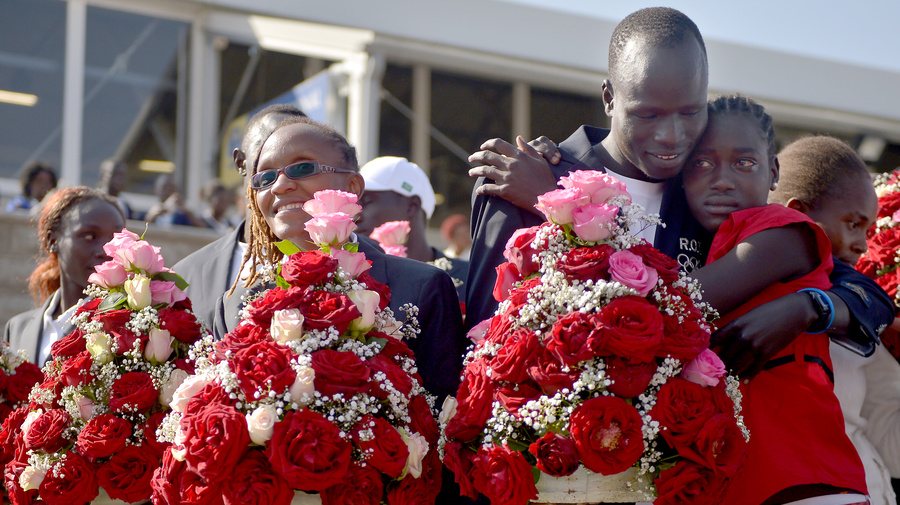 The homecoming party at Jomo Kenyatta International Airport in Nairobi appeared to surprise the five runners, who ran to hug their relatives, friends and staff from UNHCR, the UN Refugee Agency.