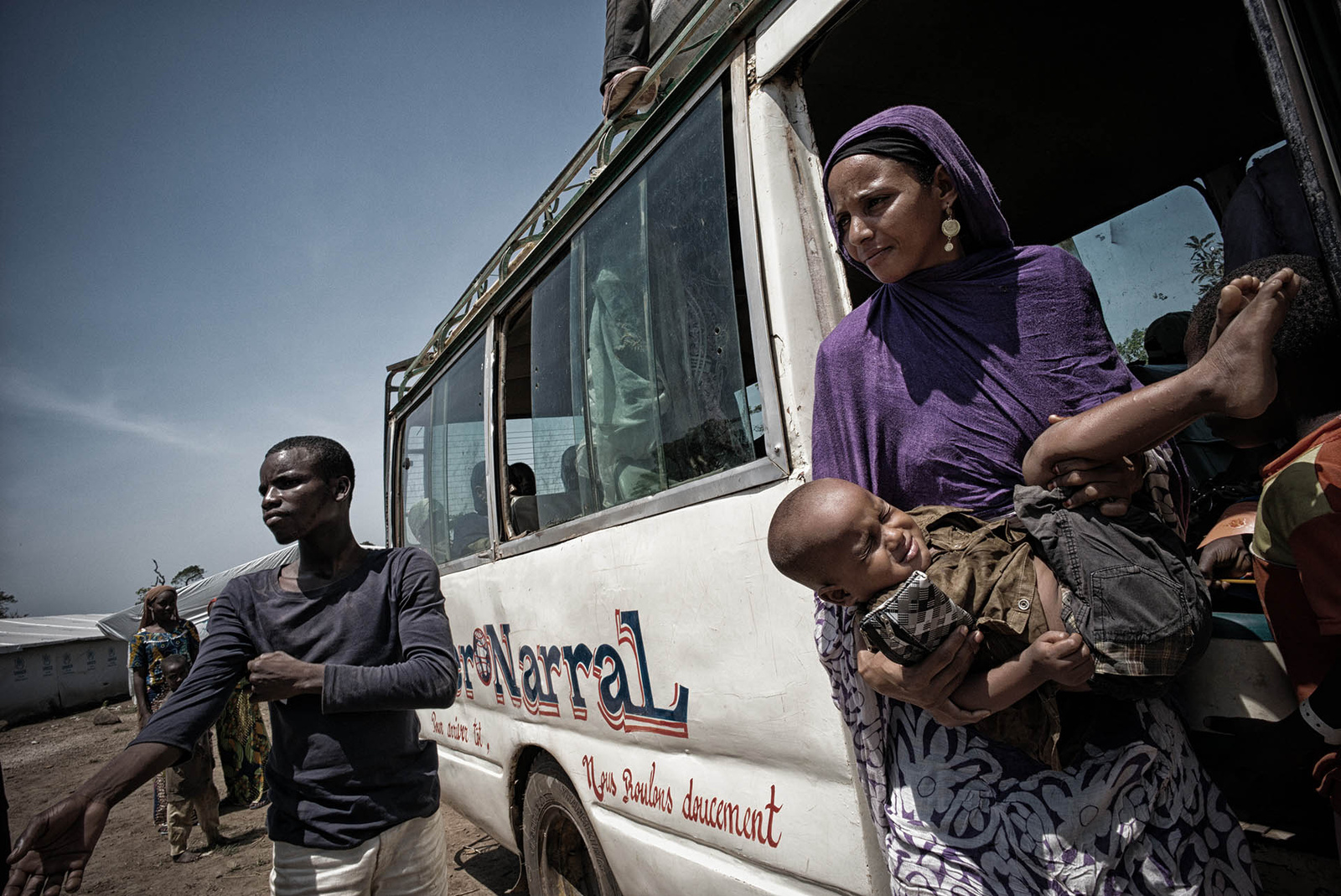 The chosen shelter is the one closest to the shelter where Idris and Adjara have been living. But there is an issue. Another woman has been living there for several days, building a cosy home for her children, and she squarely refuses to leave. As the negotiations grow tense, a curious crowd gathers around. The woman, tired of arguing, declares the discussion over by walking away. She sits down to crush the manioc leaves in her mortar, pounding and sighing loudly with each blow.