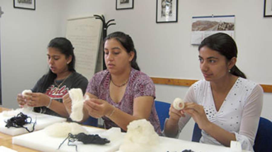 Three young Roma refugees from Kosovo learn how to make felt from wool.
