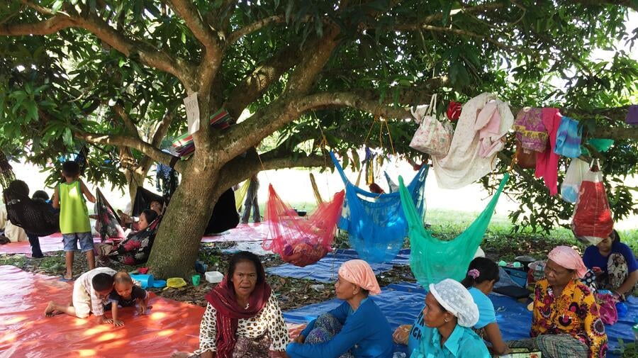 Displaced Filipina women taking shelter under trees in the municipal grounds of Pagalungan in Mindanao's Maguindanao province.