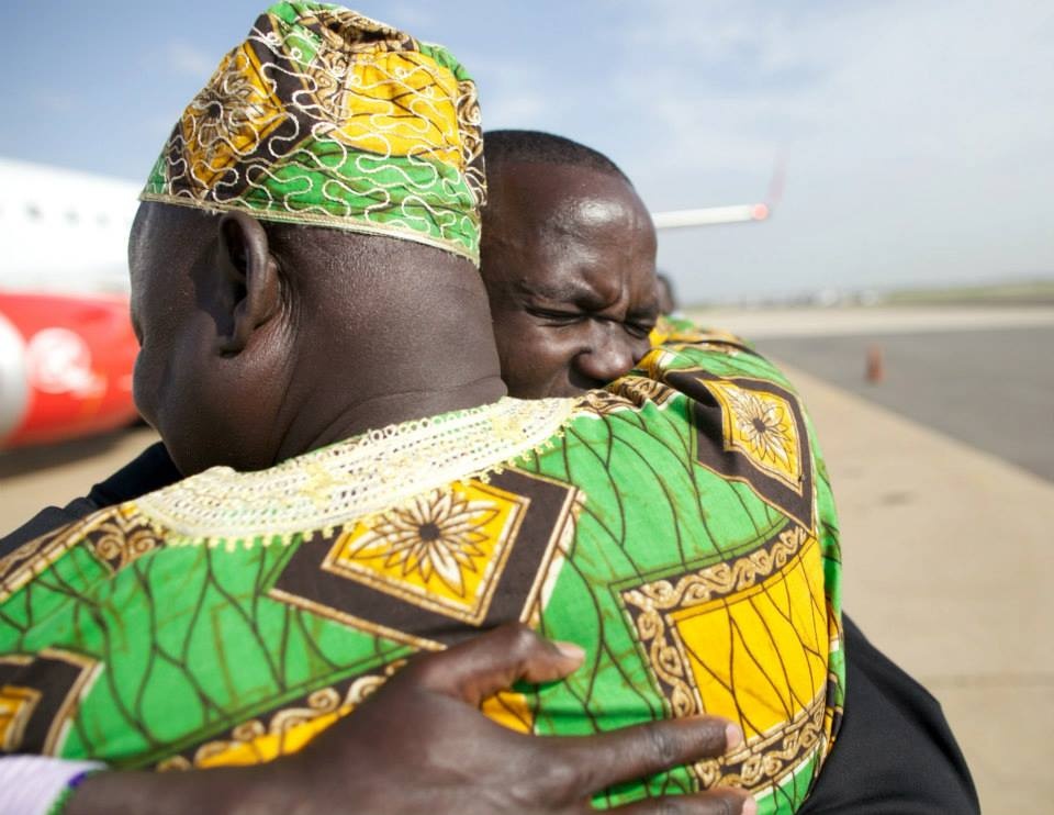 Guor embraces his uncle, Marial, who fostered him when his parents sent him away to school. Uncle Marial took Guor to the United States as his own child.