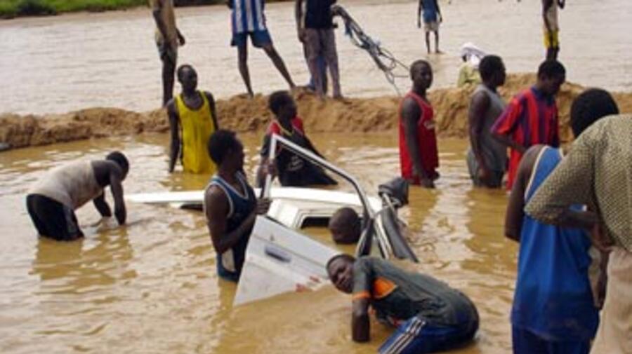Rainy days are here again. Villagers try to pull a submerged aid vehicle out of a wadi in eastern Chad.