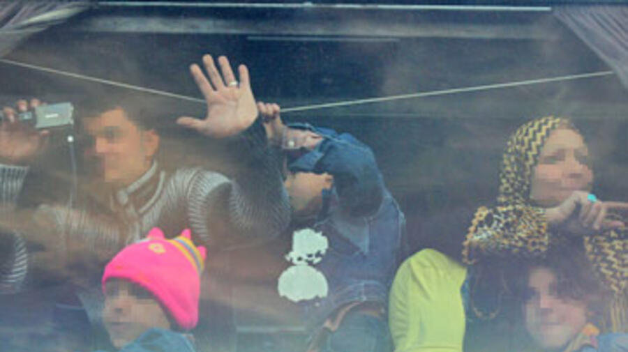 A family of Iraqi refugees look out of the back of a bus before heading back to Baghdad.