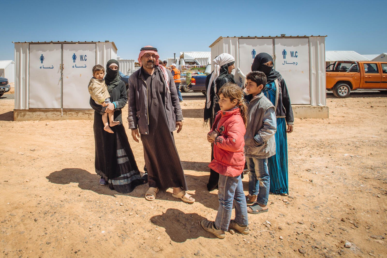 Abu Saleh and his family survey their new surroundings in Azraq refugee camp.
