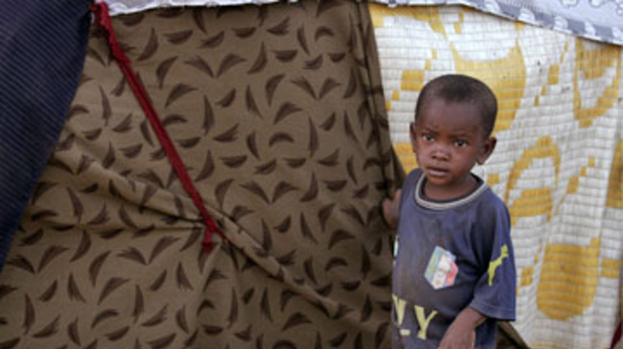 A young Somali boy stands outside his family's shelter in the small town of Afgooye. Some 46,000 people have headed towards Afgooye since Saturday to escape fighting in Mogadishu.