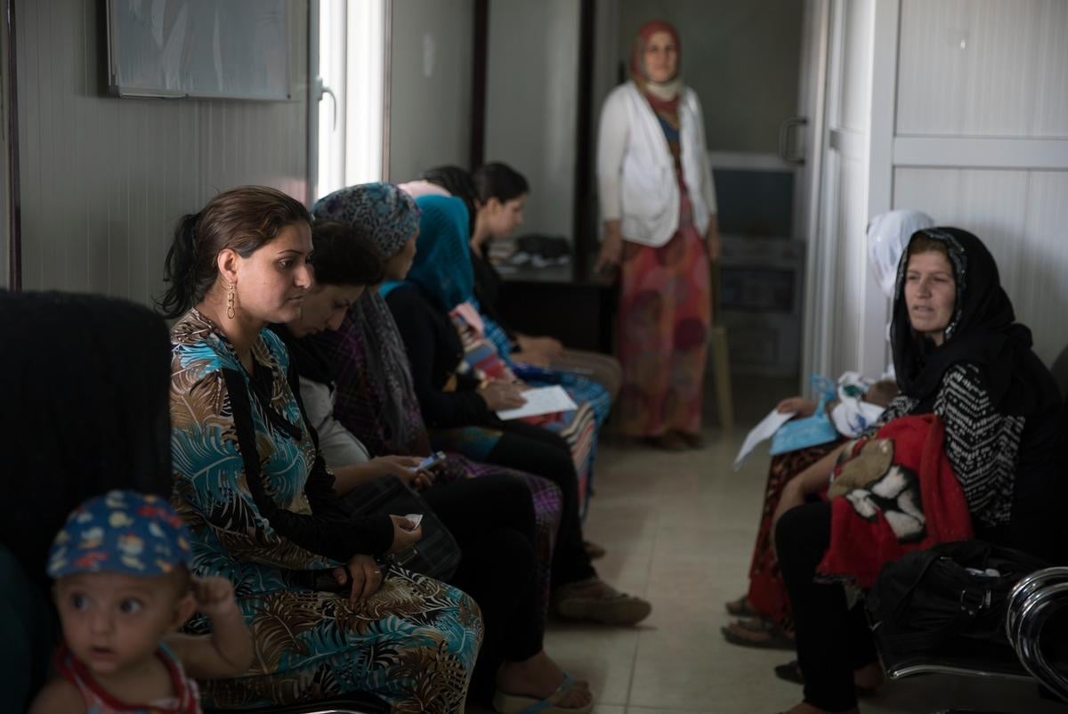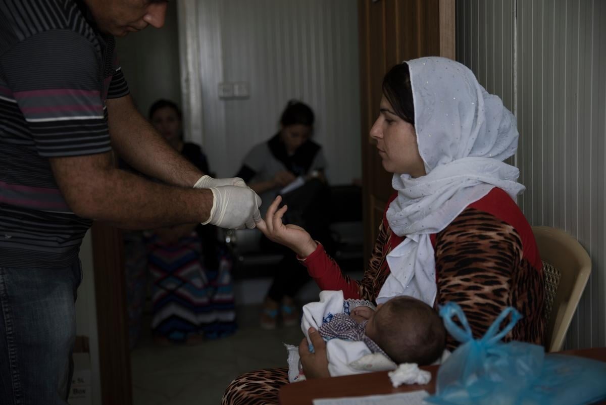A nurse at the Domiz clinic puts it more diplomatically, explaining that "the women, they just feel more comfortable" with the Syrian doctors and nurses. Even small things, like speaking a familiar dialect of Kurdish, can be enormously comforting. Selima has worked as a midwife for 27 years, first in a maternity ward in Syria before she was forced to flee to Iraq two years ago. She began working at the Domiz clinic the week it opened, commuting nearly an hour each way, six days a week. "Even when I'm tired, I still love my work here," Selima says, noting that the clinic averages eight or nine births a day.