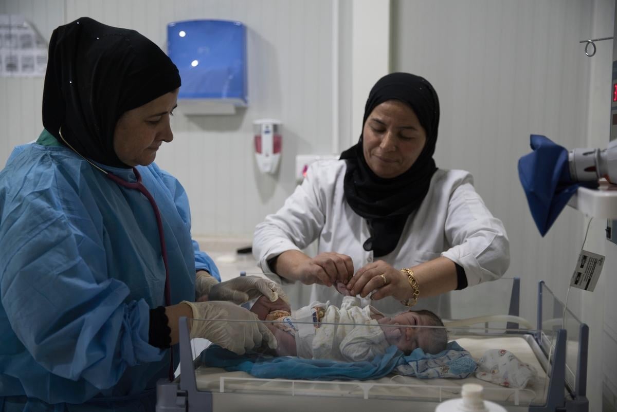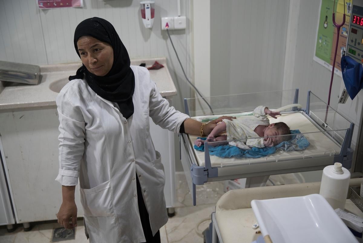 Baby Joza is tended to by nurses shortly after her birth at a maternity clinic run by Doctors Without Borders at Domiz refugee camp, near Dohuk, Iraq.