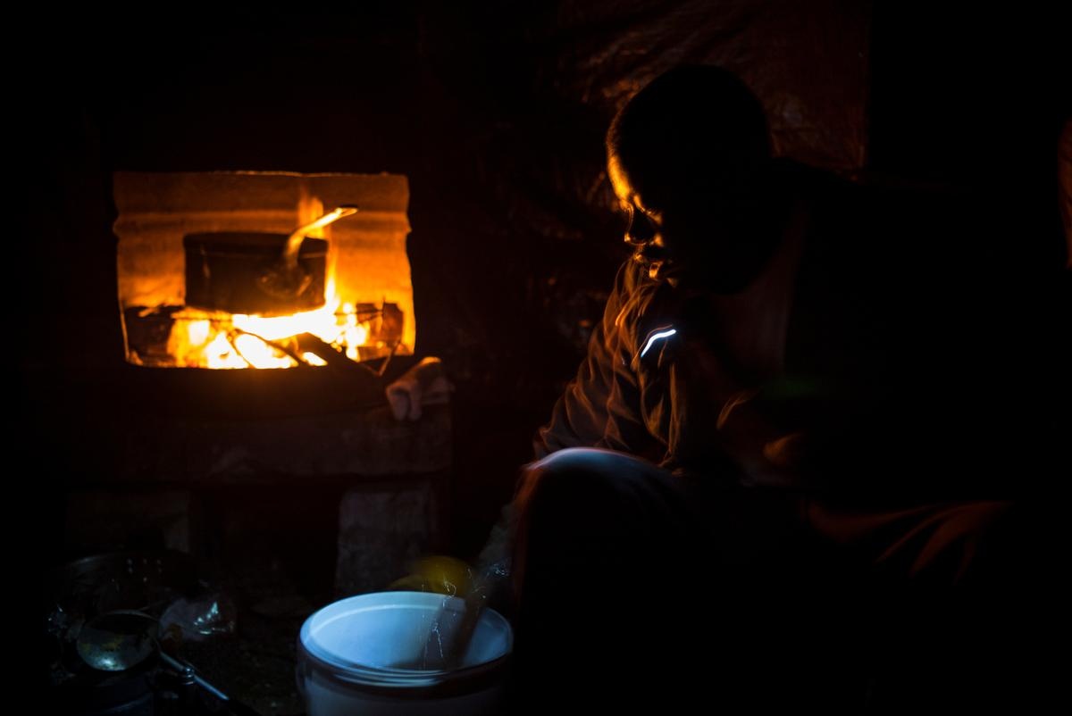 Yacine, a 22-year old asylum seeker from Sudan washes tea cups in a makeshift shelter in the socalled jungle in Calais before his departure to an accommodation centre for asylum seekers. His friends have gathered to celebrate his departure.
