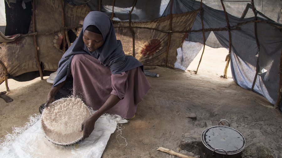 Somalia refugee Dhahiro Hussein Ali, a 22-year-old mother of four, mills sorghum for breakfast for her four children. She's inside a kitchen tukul, a separate shelter from the one where the family sleeps. She says she will be one of the first to return to Somalia when UNHCR begins assisting refugees who choose to return to three pilot areas inside Somalia next month.